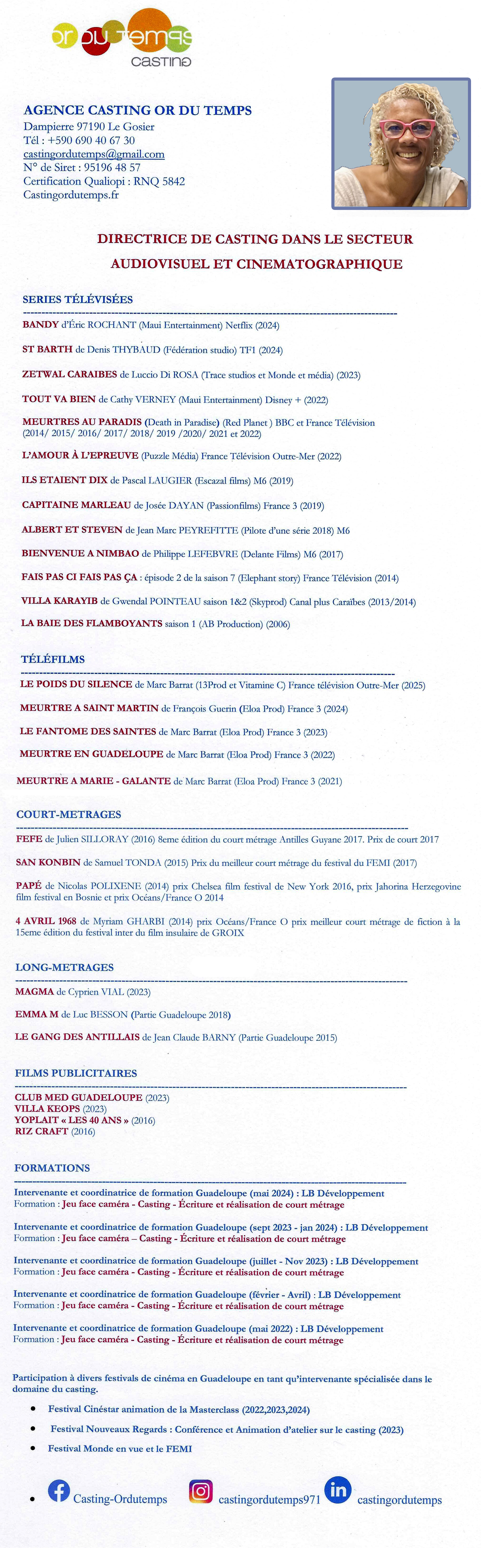 | Formation "Jeu face Caméra" en Martinique 2023, 2024 et 2025 ![]() Une véritable immersion dans l’art du jeu devant la caméra ! En partenariat avec Le Libre Acteur, LB Développement. L'agence Casting Or du Temps a accompagné 20 comédiens en Martinique à travers un parcours complet en trois niveaux : initiation, perfectionnement et maîtrise. Chaque participant a pu explorer les techniques essentielles de l’acting face caméra : gestion des émotions, placement, écoute, rythme, et travail de la vérité du jeu. Les mises en situation, extraits de scènes et exercices filmés ont permis à chacun de progresser rapidement et de gagner en assurance. Résultat : des comédiens plus confiants, mieux préparés aux exigences des castings et prêts à relever de nouveaux défis professionnels. Une formation qui s’impose comme une référence pour développer son talent et briller à l’écran. |