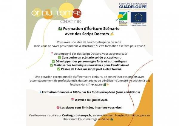 | Formation d’écriture de scénario Court-métrage et Série ![]() ✍️ Formation d’écriture de scénario – Court-métrage & Série Vous avez une idée de film ou de série et souhaitez la transformer en un scénario solide et structuré ? Cette formation d’écriture de scénario vous accompagne de l’idée au script, grâce à un encadrement assuré par des Script Doctors professionnels. Conçue pour les auteurs débutants ou émergents, cette formation permet de : structurer un récit efficace, développer des personnages forts, maîtriser les bases de la narration audiovisuelle, aboutir à un projet prêt à être présenté ou tourné. La formation se déroule d’avril à mi-juillet 2026 en Guadeloupe et peut être financée à 100 % par les fonds européens (sous conditions). |